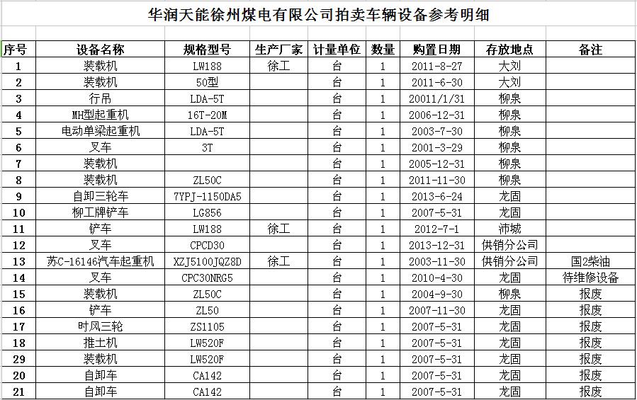 我公司受委托,定于2017年4月12日10時在徐州市中山南路55號7樓本公司大廳公開拍賣華潤天能徐州煤電有限公司各型車輛設(shè)備約二十余臺,主要包括各型裝載機、叉車、起重機、鏟車、推土機、自卸車等。