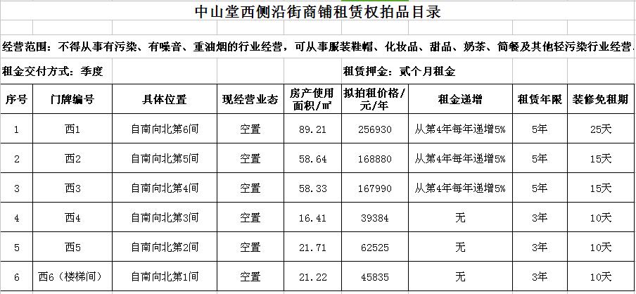 關(guān)注微信公眾號(hào)我公司受委托,定于2017年6月7日10時(shí)在徐州中山南路55號(hào)7樓拍賣(mài)徐州市中山堂一層西側(cè)沿街門(mén)面房租賃權(quán),共計(jì)6間,面積分別為16.41㎡、21.22㎡、21.71㎡、58.33㎡、58.64㎡、89.21㎡。租賃年限為3-5年。