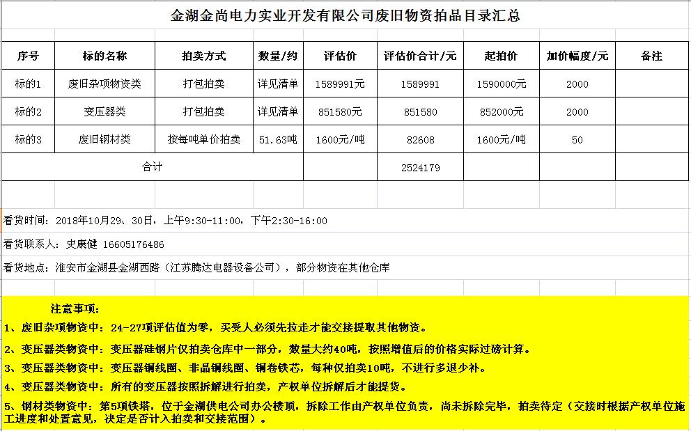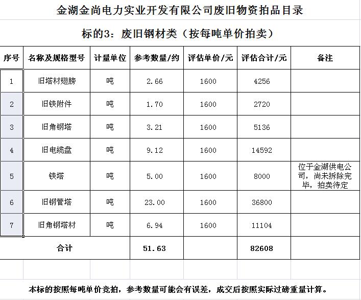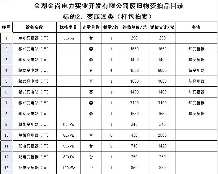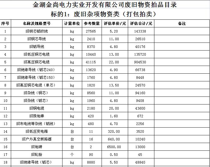 關(guān)注微信公眾號受金湖金尚電力實(shí)業(yè)開發(fā)有限公司委托,我公司將通過中國拍賣行業(yè)協(xié)會(huì)網(wǎng)絡(luò)拍賣平臺以網(wǎng)絡(luò)競價(jià)的方式公開拍賣廢舊物資一批,主要包括:電纜、導(dǎo)線、鋼芯鋁絞線、角鋼塔、鐵附件、金具、變壓器、箱式變電站、空調(diào)、電腦等(詳見拍品目錄)。
