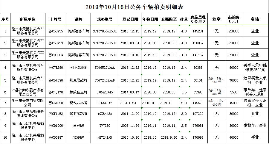 關(guān)注微信公眾號受委托,我公司定于2019年10月16日13:00時在徐州市銀地二手車交易市場四樓東南拍賣大廳通過現(xiàn)場和汽車街網(wǎng)絡(luò)拍賣平臺同步進(jìn)行的方式公開拍賣以下公務(wù)車輛: